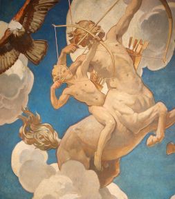 Uma das versões associa a imagem do centauro Quíron, mestre de muitos heróis, ao signo e à constelação.