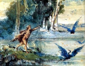 2. Hércules, pues, partió a realizar su noveno trabajo. Durante largo tiempo buscó y buscó, hasta que localizó el pantano. A medida que se aproximaba, un coro de infinidad de pájaros elevaban el tono de sus graznidos amenazadores. Eran pájaros muy grandes, feos y feroces. Su pico era de hierro y afilado como un puñal y sus plumas eran de acero y herían de muerte a quien alcanzaban. Y sus garras no iban a la zaga. Pero había tres que sobresalían. Eran enormes y, apenas percibieron a Hércules se precipitaron sobre él. Él se mantuvo en su lugar y, con su garrote, fue rechazando sus ataques. Logro golpear a uno en el dorso y las plumas que desprendió se clavaron en la tierra alrededor de Hércules. Luego, se alejaron.