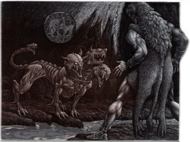Satisfecho con la autorización, Hércules siguió su camino en busca de Prometeo. De repente, Cerbero apareció y saltó sobre él gruñendo. Hércules agarró la cabeza central, donde estaba la garganta de las tres cabezas y, oprimiéndola con todas sus fuerzas, la estranguló a pesar de la feroz resistencia del monstruo.