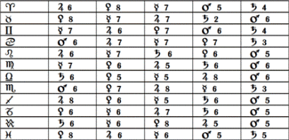 Los regentes de la triplicidad ofrecidos por Doroteo son como sigue, en lo casos nocturnos se intercambia el segundo regente por el primero y el tercero permanece invariable: