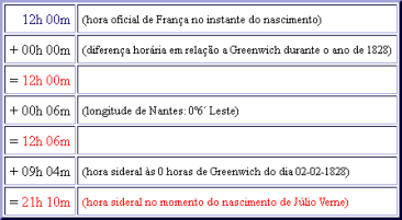 A confiar nos registros que chegaram até nós, Júlio Verne nasceu em Nantes, em França, no dia 8 de Fevereiro de 1828, pelas 12 horas locais. A hora sideral do seu nascimento é 21 horas e 10 minutos. Debrucemo-nos por um momento sobre este conceito de tempo sideral.