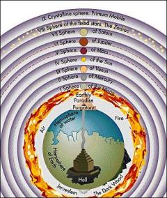 O modelo geocêntrico tornou-se muito popular. Foi adotado pela religião cristã e publicitado por teólogos, filósofos e mesmo escritores e muitas foram as fantasias criadas a partir dele. Na Divina Comédia de Dante (1307-1321), o Inferno encontra-se no interior da Terra; a alma, no seu caminho para Deus, deve subir através do Purgatório, das nove esferas dos planetas, das estrelas e da esfera de cristal, até chegar ao Paraíso.