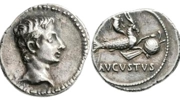 Figura 1. Denario de 16 a.C., posiblemente emeritense. Busto de Augusto a izquierda. Capricornio a derecha con orbe, timón y cuerno de la abundancia.