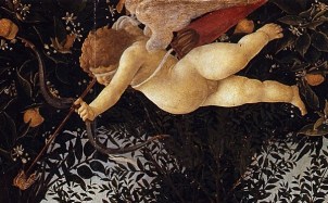 Es Semiramide, después de haber tenido todas las propiedades que Flora le da. Y además, en la hierba, están las anémonas que recordamos que aportan la magia verdadera y aparece Semiramide reinante, bella, segura de sí misma, después de haber recibido por medio de la magia de Ficino todas esas virtudes, entronizada por un mirto, planta de Venus, que proporciona gran atracción personal y éxito, ella nos mira, pero no nos mira a nosotros, se mira a ella misma, puesto que este cuadro estaba destinado a ella, era para contemplarlo ella, repito, ella se mira a ella misma después de su transformación mágica, sí, transformación mágica. Porque como dice Marsilio Ficino en De Vita Coelitus Comparanda, tercer libro del De Vita: “Se sabe por experiencia que si uno opera la elaboración en los debidos modos y es capaz de soportarlo, muta de algún modo, después de la purificación rara y de la oculta propiedad de ello, la cualidad del propio espíritu, la naturaleza del cuerpo y en parte los movimientos del ánimo, y casi reconquista juventud, en modo tal que parece renacer: y de aquí ha nacido la tradición que Medea y los magos restituían habitualmente, con el uso de ciertas hierbas, aquella juventud…”. De modo que así, Semiramide ha renacido, se encuentra en una nueva consciencia espiritual, preparada para conocer los grandes misterios del cosmos, como declara Frances A. Yates en el libro Giordano Bruno y la Tradición Hermética en el capítulo “Magia renacentista y ciencia”, dice así: “La Magia renacentista como fator responsable de cambios fundamentales en las concepciones humanas sobre el cosmos”. Ahora, Semiramide, tranquila y renacida, nos muestra con su mano derecha, otro espectáculo, pero antes, encima de ella, tenemos al Divinus Cupido, no Cupido, no. El Divinus Cupido es el Amor Divino que ha llenado el Santo Lugar (figura 5),
