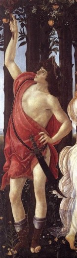 En primer lugar observamos que está ambientado en un bosque de naranjos, porque se dice que estos árboles se le atribuyen a la familia Medici y sí, es posible, pero hay que considerar las propiedades mágicas del naranjo, es una planta no de Venus, sino del Sol, y proporciona una atmósfera de paz y amplifica los poderes mágicos, así que ya tenemos el ambiente perfecto para lo que va a ocurrir en este cuadro. Además, los naranjos están en flor, la flor del azahar; que como virtudes mágicas tiene el favorecer los matrimonios, dar amor, paz espiritual y atrae a los seres amados; también se asocia a a pureza de las novias, aporta alegría y provoca sueños que liberan de tensiones emocionales el inconsciente, es muy útil para la meditación.