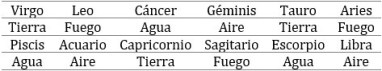 División de los Signos Zodiacales según los Cuatro Elementos Naturales