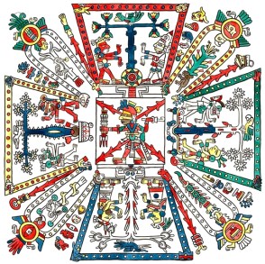 Os mesoamericanos possuíam ainda uma complexa cosmografia (visão do espaço) e cosmogonia (origem do universo). Acreditavam que o espaço horizontal era formado por cinco direções: poente, nascente, norte, sul e centro. Estas linhas partiam de um centro e se propagavam para o horizonte, de acordo com cada direção. Estas cinco regiões eram habitadas e governadas por pares de deuses: o leste pertencia a Tonatiuh e Itztli; no oeste encontramos Chalchiuhtlicue e Tlazolteotl; ao norte teríamos Tlaloc e Tepeyollotl; no sul estaria Mictlantecutli e Cinteotl e, finalmente o centro era regido por Xiuhtecutli, o deus do fogo.