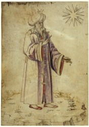 De Aristóteles (fig. 9), a quien vemos con un tocado más occidental que el Hermes de antes en el mismo manuscrito de alquimia, cita Messala también diez obras astrológicas, sobre genethlialogía, interrogationes, e influencia del Zodíaco y de los planetas. Pero la que causó furor en los siglos XIII y XIV (cuando ya su filosofía contaba con la aquiescencia de santo Tomas y san Alberto Magno) fue el Secretum secretorum o Poridad de poridades a que hacíamos referencia al comienzo de este trabajo y que, puesto bajo su nombre, reforzó la aceptación de determinados principios y máximas astrológicas, alquímicas y mágicas vertidas en él.