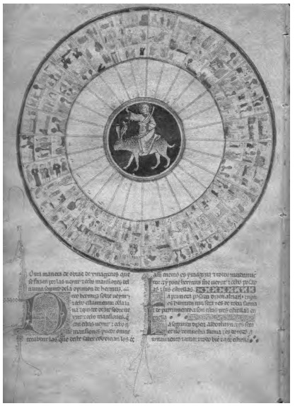 Pero además de esta obra, que fue de las más influyentes en el mundo medieval, circularon bajo el nombre de Aristóteles otras muchas puramente astrológicas de algunas de las cuales, vinculadas a tratados de carácter hermético, sólo tenemos los títulos. Entre esas obras podemos citar un Liber Aristotilis de ducentis quinquaginta quinque Indorum uoluminibus universalium questionum tam genetialium quam circularium summam continens de un manuscrito bodleiano del XIII, traducido del árabe al latín por Hugo de Santalla entre 1140 y 115133 o este (fig. 12) Libro de las imágenes también del escritorio alfonsí donde el nombre de Aristóteles se repite insistentemente junto al de Tolomeo, un descarado anacronismo, incluso asumiendo su condición regia.