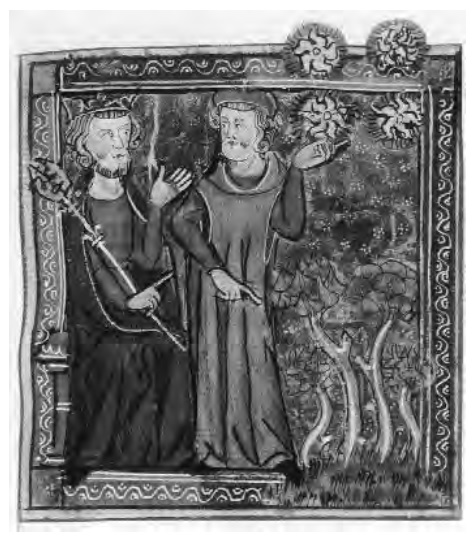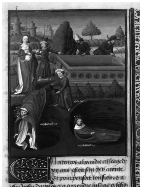En estos ambientes ingresa también como autoridad astrológica el propio Alejandro, arropado por su famosa entrevista con los astrólogos caldeos, a las puertas de Babilonia (fig. 13), o por su condición de hijo de Nectanebo difundida por la exitosa popularidade de la Vita Alexandri del Ps.-Calístenes de la que vemos en la fig. 14 el detalle de la muerte del rey astrólogo; pero, principalmente, por sus apócrifos intercambios epistolares con su maestro o con otros personajes orientales. Fruto de esa fama es la atribución al discípulo de Aristóteles de un tratado sobre botánica astrológica (Virtutes septem herbarum et septem planetarum secundum Alexandrum imperatorem), del que hay tradición bizantina y que cita sin ninguna vacilación el propio Alberto Magno en su Liber aggregationis o Liber secretorum de virtutibus herbarum. Tal vez haya que poner en relación con este perfil astrológico de la personalidad del rey los Mathematica que encontramos en manuscritos del X y XI bajo el nombre de Alcandro (Alhandreus), donde Alejandro de Macedonia es citado varias veces como autoridad y se recogen unos Excerpta de los libros de Alejandro, astrólogo, rey y una Carta de Argafalan a Alejandro.