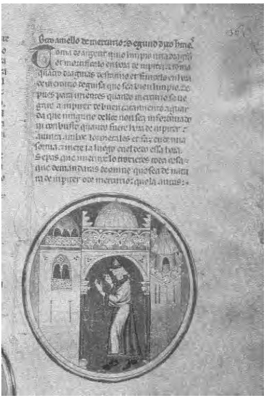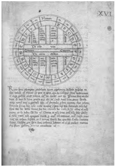 Como tal (o como Esfera de Apuleyo) es citada con frecuencia en manuscritos latinos del IX-XI37 y en la fig. 16 podemos verla en una reproducción de un códice latino del siglo XV. A ella se refiere sin duda Juan de Salisbury (1120-1180) cuando habla de adivinación “mirando la llamada Tabla de Pitágoras”. Del resto, y sin querer ser exhaustivo, puedo mencionar los Placita de los pitagóricos sobre los cometas, el Método de Pitágoras, ya mencionado en la época helenística por Eudemo (IV a.C.), clasificaciones tipológicas a partir de los planetas que leemos en los códices griegos, las Divinationes Pythagoricae y un Libro de los paranatellonta que aparece sin nombre de autor en el manuscrito vaticano alfonsí (ff. 1r-8v) y que D’Agostino le ha atribuido por su vinculación con el Libro de las formas e de las imágenes (1279) (Ms. Scorial. h-I-16) del que sólo queda una Tabla con el epígrafe: “De la tercera parte de este libro, que fabla, segund el dicho de Pitágoras, de las figuras que suben en los grados de los doze signos e de las obras d’ellas en las nascencias”. Por lo demás, su nombre es citado mucho en la Edad Media, solo (como en el Compendium medicinae de Gilberto de Inglaterra -XIII-) o acompañado de los de Sócrates, Anaxágoras, Demócrito y Parménides en la Turba philosophorum, un tratado de alquimia muy popular a partir de comienzos del siglo XIV, o de Sócrates, Platón y Anaxágoras en el Experimentarius, tratado de geomancia ligado al nombre de Bernaldo Silvestre (XII). Para terminar, nuestro Arnaldo de Vilanova en el Rosario de filósofos (también llamado El tesoro de los tesoros y El más grande de los secretos) lo cita igualmente como autoridad con Hermes, Platón y Aristóteles o en su Obra perfecta con Platón, Galeno, Demócrito e Hipócrates.