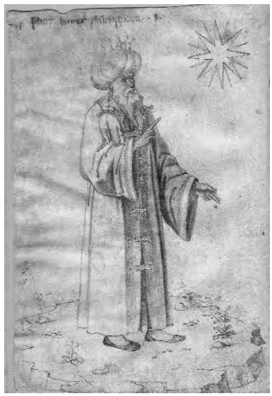 Se menciona a Alejandro y Aristóteles, cuyas cartas hemos visto a lo largo de este trabajo incardinadas en la historia de la astrología. Se sigue la autoridad de Apolonio de Tiana, cuyo nombre adopta la forma de Beylus (en otros textos aparece también como Belenuz, Balinus, Belinus y Abulus).49 En cuanto a los astrólogos griegos más importantes, el Picatrix esgrime, por supuesto, como fuente de autoridad a Tolomeo, aunque esta se refiere sólo al Centiloquium50 y tal vez alguna otra obra apócrifa51 y Hermes Trismegisto, también citado como Hermes, Mercurio y probablemente Thoos y tanto para cuestiones relacionadas con la fabricación de los talismanes, en cuyo caso la fuente de autoridad es sobre todo el Lapidario como para otros temas específicos de magia y filosofía o de astrología (aunque relacionados también con los talismanes), como los decanos y las particularidades de los signos del Zodíaco (con cita del libro Sobre las imágenes) o los condicionamientos astrológicos de las prácticas religiosas;59 pero también le son conocidas las obras de Doroteo de Sidón, a quien se cita con el nombre habitual de Dorothius o en la forma transmitida por los árabes de Rozuz. De todos modos, no faltan citas de otros filósofos, indirectamente ligados a la historia de la astrología y que dan cierto peso científico a la obra. Es el caso de Empedocles, también citado con los nombres Abenteclis y Bandaclis;64 de Sócrates y Platón, del que se citan obras apócrifas sobre magia astrológica y a quien le atribuye doctrinas sobre la influencia de los planetas sobre el cuerpo; de sus obras auténticas sólo es citado el Timeo. En cambio, de Aristóteles, además de obras apócrifas sobre magia y astrología, encontramos relacionados los principales tratados filosóficos. Y no podía faltar Pitágoras, tan prestigioso en estos ámbitos esotéricos, a quien también se le atribuyen opiniones sobre las figuras del cielo y 7 consejos de conducta moral necesarios para la fabricación de los talismanes. Completan este amplio panorama de autoridades griegas los médicos Galeno (Galienus), bien por su filosofía natural o como autoridad en la elaboración de remedios curativos o de talismanes e Hipócrates (Ypocras), no sólo por doctrinas extraídas de tratados auténticos como el Sobre los aires, aguas y lugares, sino también por dogmas más propios de la iatromatemática.