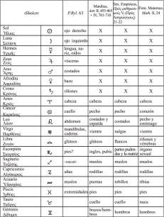 Resultan curiosas las discordancias entre las partes del cuerpo indicadas en el papiro y las que da Manilio. Este parece establecer las relaciones en función de los parecidos de las formas y la asociación de ideas. Y así vemos que la descripción, que evoluciona en el sentido del movimiento de la aguja del reloj partiendo de la cabeza, indica que Aries, animal de fortísima testa, rige la cabeza; el cangrejo, con su gran caparazón, el pecho; el toro, animal de formidable cuello, rige esta parte de la anatomía humana; a los gemelos corresponden los miembros “dobles”, brazos y hombros; los costados, al león de lomo fabuloso; el bajo vientre a la maternal Virgen; los glúteos bien equilibrados, a la balanza; el pubis a escorpión que exhibe el aguijón; los muslos, al arquero que tensa el arco ayudándose de la potencia de sus piernas; el carnero genuflexo rige las rodillas; el medio acuático rige las piernas, que un hombre sumerge y atraviesa caminando los ríos; los peces, por su forma y su movimiento, rigen los pies. Esta distribución basada en la lógica y los parecidos razonables no coincide en todos los textos. Así, vemos algunas diferencias en las atribuciones en los textos de Manilio17 y Empírico, y muchas diferencias entre estos y el P.Ryl. 63.