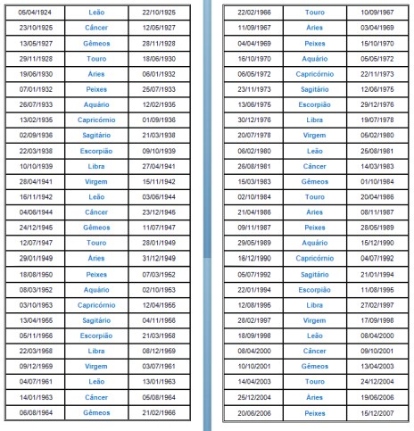 Localize seu período de nascimento e o signo do seu eixo nodal, e compare com as pessoas famosas que têm o eixo nodal nesses signos, abaixo: