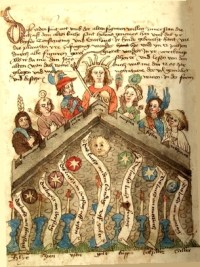 As Sete Artes Liberais. Livro de registro da biblioteca da Universidade de Tübinger (séc. XV). Da esquerda para a direita: Geometria, Lógica, Aritmética, Gramática, Música, Física (ao invés da Astronomia) e Retórica. Abaixo, as analogias com os céus (repare no Sol sob a Gramática, enquanto para Dante deveria ser a Aritmética) e a Lua sob a Retórica (para Dante, seria Vênus).