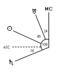 La generación 1 es la del padre de Addey; él es la generación 2 y sus hijos la generación 3. Recordemos que las uniones entre los planetas están relacionadas con la armónica 5ª, cuyos ángulos no sólo son de 72º y 144º, o sea, el quintil (360º/5) y el biquintil, dos veces 72º ó la 2/5 partes del círculo, sino los distintos valores que surgen como fracciones del quintil. Por ejemplo, 36º y 108º, porque ambos están basados en la cuarta parte del quintil y sus múltiplos, o sea, 54º y 90º, porque 18 x 3 = 54 y 18 x 5 = 90. Además, existe un aspecto de 24º porque es un tercio de 72 y hay otro de 45º porque la mitad de 36 que es 18 sumado a la mitad de 54 que es 27 (18 + 27) forman 45º. Todavía hay otro aspecto relacionado con el quintil y es el de 99º (formado por la suma de la mitad de 90º y la de 108º, o sea, 45 + 54 = 99).