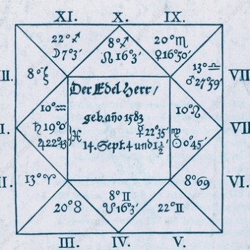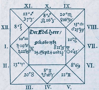 Albrecht von Waldstein horoscope. Cast for Bohemian military leader Albrecht von Waldstein (1583-1634, also Albrecht von Wallenstein) in 1608 when he was 25, by the astronomer Johannes Kepler, this horoscope accurately foretold a life of ambition and violence. The centre square gives the date and time of his birth and identifies him in German as ‘The Noble Man’. The figures in the triangles note the positions of various heavenly bodies that influence 12 areas of his personality. Astrological symbols identify the signs of the zodiac.