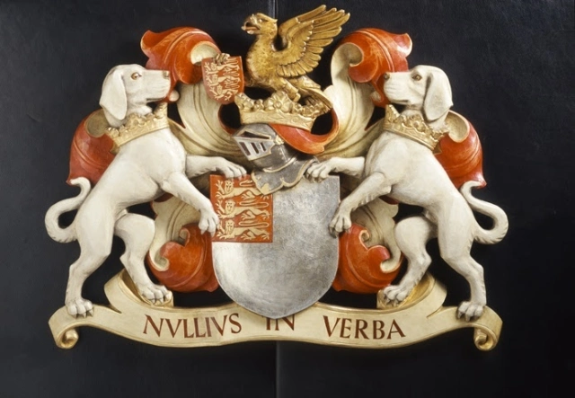O escudo vazio – além do quartel sobreposto da Inglaterra, mostrando o patrocínio do monarca – é em todos os sentidos uma ‘tabula rasa’, uma lousa vazia, com todas as escritas anteriores removidas. Um novo começo, uma bancada de trabalho clara para experimentação e descoberta. O lema, nullius in verba, ‘nas palavras de ninguém’, ou na linguagem moderna ‘não tome como verdade a palavra de ninguém’, mostra uma rejeição de todas as opiniões e conhecimentos anteriores, procurando, em vez disso, provar a verdade apenas por meios experimentais. A tradição oral, se diz aqui, está morta.