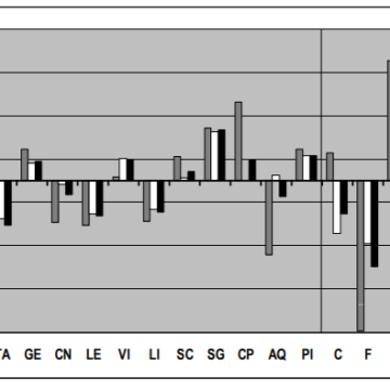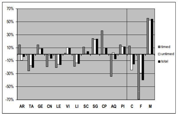 Figure 10. Totais de sete fatores (sem Ascendente) por signo e qualidade, plotados como desvio ponderado (%) das frequências teóricas derivadas de grupos de controle (Ctrl1).