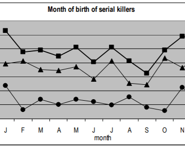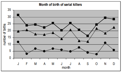 Figura 2. Frequência de nascimentos por mês (corrigido para o número de dias por mês) no conjunto de dados de 77 assassinos em série com hora de nascimento conhecida (pontos), 216 assassinos em série sem hora de nascimento (triângulos) e na amostra total de 293 assassinos em série (blocos).