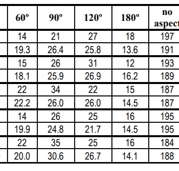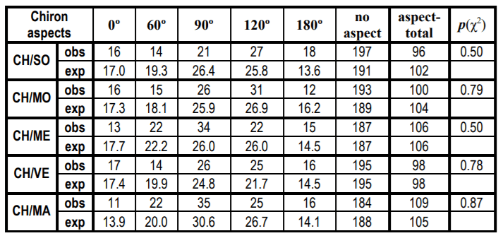 Tabela 16. Comparação entre as frequências de aspectos obtidas experimentalmente do planetoide Chíron (CH) em 293 serial killers.