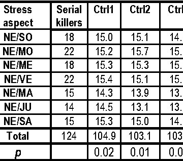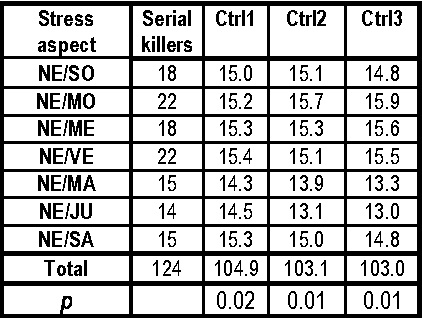 Tabela 6. Aspectos de “estresse” de Netuno em 77 serial killers com horário de nascimento disponível.