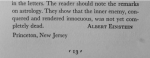 Não tenho ideia de quantas horas eu demorei para encontrar a origem. Vem de uma introdução que Einstein, no final de sua vida, concordou em escrever para o livro de Carola Baumgardt sobre a vida e a correspondência de Kepler: “O leitor é convidado a anotar as observações sobre a astrologia. Elas demonstram que o inimigo interior [em Kepler], que o derrotou e tornou-se inofensivo, ainda não estava completamente morto“.