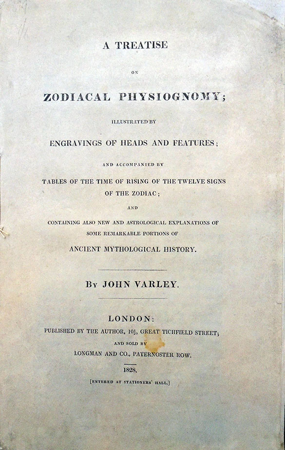 Vejamos o curioso livro de Varley. Seu título completo é Treatise on Zodiacal Physiognomy, illustrated with engravings of heads and features, accompanied by tables of the time of the rising of the Twelve Signs of the Zodiac, and containing also new and astrological explanations of some remarkable portions of ancient mythological history. O livro, que consiste em sessenta e quatro páginas em oitavo de impressão tipográfica e cinco placas, quatro das quais foram gravadas por Linnell, fazia parte de uma série a ser concluída em quatro partes e foi impresso pelo autor em 10 Great Titchfield Street, Oxford Street. Foi publicado em 1828 e vendido pelos Srs. Longman & Co. a cinco xelins. As outras três partes não se concretizaram.