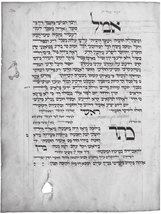 Enquanto na roda do zodíaco do Oppenheim Maḥzor o Escorpião é mais naturalista (fig. 4), nas margens do piyyut para o orvalho ele é desenhado como um híbrido com bico e cauda longos, enfatizando seus aspectos prejudiciais (fol. 64r, fig. 2). Além disso, é o Escorpião na forma híbrida com um aguilhão longo que aparece mais uma vez no Oppenheim Maḥzor (fol. 34r, fig. 18) como uma ilustração para um piyyut (krovah) para purim (ךברו למא). Este piyyut, baseado em um midrash conhecido em várias versões, conta como Haman examinou os signos do zodíaco a fim de encontrar a data mais apropriada para cometer o assassinato dos judeus. Começando com o Cordeiro (Áries) e concluindo com o Peixe (Peixes), ele os considerou cuidadosamente um a um, mas descartou todos, exceto o último, cada um por um motivo diferente. No piyyut, o Escorpião aparece em sua forma agressiva , utilizada em apoio a Israel: “aquele que habita em um escorpião [= Israel] o picará [= Hamã] como um escorpião (/ ברקע לע בשויו ברקעכ וצקע).”