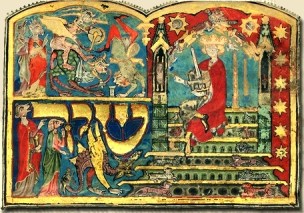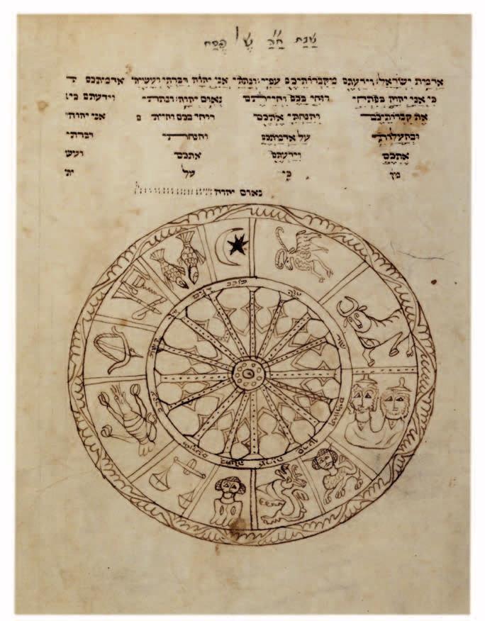 A roda do zodíaco no Oppenheim Maḥzor é ainda mais peculiar e não encontra paralelo em outros mahzorim. Embora os signos do zodíaco ao longo do piyyut sejam originalmente baseados em simbologias semelhantes dos signos em calendários de livros litúrgicos cristãos, a roda do zodíaco do Oppenheim Maḥzor leva a uma direção completamente diferente, expondo outra dimensão do interesse do iluminador pela cosmologia. Tais esquemas são típicos de miscelâneas de textos sobre astronomia, e computus, a medida do tempo que calcula a data móvel da Páscoa e o calendário da Igreja. Essas coleções são conhecidas no Ocidente desde os tempos carolíngios e floresceram nos séculos seguintes em centros monásticos de aprendizagem. Ilustrações das constelações e do zodíaco, que remetem às tradições visuais greco-romanas, eram geralmente parte integrante deles. Um exemplo é uma miscelânea de Zwettl por volta de 1200 (fig. 20). Aqui no centro do roda do zodíaco, o Sol e a Lua estão sentados juntos em um banco. Nosso artista foi inspirado por um desenho semelhante da roda, mas fez algumas mudanças significativas. Enfatizando a base lunar do calendário judaico, ele eliminou o sol e substituiu a lua pela lua crescente e pela estrela, realocando-os entre os outros signos do zodíaco com o título “kokhav” (estrela) (fig. 4). A posição do símbolo messiânico da lua crescente e da estrela entre os signos do zodíaco próximo ao Cordeiro – o signo do mês da redenção – enfatiza o aspecto messiânico do tempo cosmológico. Também pode ter substituído o signo do zodíaco perdido do Menino, que não é mostrado na roda. Tal possibilidade é apoiada por uma interpretação astrológica de R. Eleazar de Worms para um versículo que descreve a praga do primogênito (Êxodo 12:29). Aqui, o Menino e o Cordeiro são definidos juntos como os signos do zodíaco da redenção futura:
