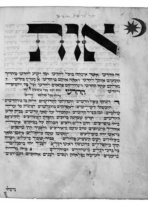 O motivo da lua e da estrela no Oppenheim Maḥzor também tem paralelos em outros Ashkenazi maḥzorim, onde a ilustração geralmente é restrita ao piyyut “Sinal deste mês” para o sábado antes da Lua Nova de nisan, uma ilustração que também se encontra no Oppenheim Maḥzor (fig. 3). Os versos deste piyyut são baseados no mandamento bíblico que se refere a nisan como o primeiro mês do ano judaico: “Este mês será para vós o princípio dos meses; será o primeiro mês do ano para vocês” (Êxodo 12: 2). O mandamento era tradicionalmente interpretado como relacionado à consagração da Lua Nova e à fixação do calendário judaico. Um significado messiânico conecta a redenção bíblica do Egito, que ocorreu no mês de nisan, com a salvação futura, que acontecerá no mesmo mês: “[…] e quando Ele escolheu Jacó e seus filhos, Ele designou para eles uma Lua Nova para a redenção na qual Israel foi redimido do Egito e na qual eles estão destinados a serem redimidos novamente”. Na ilustração o piyyut “Sinal deste mês” do Ashkenazi maḥzorim, e os dois luminares da lua crescente como a estrela foram incluídos como o “signo” cosmológico de nisan (fig. 19). A estrela, neste contexto, pode ter um significado messiânico com base no versículo bíblico “surgirá uma estrela para Jacó, e um cetro se levantará de Israel” (Números 24:17). De acordo com uma tradição midráshica comum, a estrela no verso simboliza o Messias, uma interpretação diretamente aludida em alguns mahzorim iluminados. No Oppenheim Maḥzor, a iconografia tradicional foi novamente expandida e a combinação da lua crescente e a estrela foi repetida como um leitmotif cosmológico usado em vários pontos do calendário: a lua nova, o primeiro mês do ano litúrgico (nisan), e dentro da roda do zodíaco, onde aparece ao lado do Cordeiro, o signo do zodíaco de nisan; em todos os casos, esse motivo enfatiza o aspecto lunar do calendário hebraico.