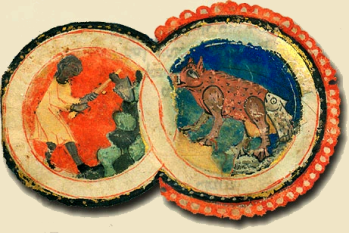 Outras possíveis conexões com o âmbito visual islâmico foram identificadas por Storm Rice e Hartner na imagem de Gêmeos (Gêmeos) no volume do Maḥzor Tripartido de Budapeste. Aqui, ambos são projetados como pessoas com cabeça de animal em roupas curtas, juntos e de frente um para o outro seguram uma vara com uma esfera brilhante em seu topo (figs. 5, 7). Um formato semelhante é encontrado novamente em vasos persas de bronze dos séculos XII e XIII, como o Vaso Vescovali (fig. 8) e o Wade Cup (fig. 9), em que, como no manuscrito de Budapeste, os gêmeos seguram, juntos, uma longa haste que carrega no topo uma máscara bestial em vez de um orbe brilhante. A máscara nos exemplos muçulmanos é um resultado das relações percebidas entre os signos do zodíaco e os planetas. Os astrólogos islâmicos dividiram a roda do zodíaco em seções radiais, cada uma subordinada a um dos planetas. Eles também discutiram um pseudo-planeta invisível adicional, o Dragão, que causou eclipses do sol e da lua. De acordo com essa tradição, a exaltação da cabeça do dragão era no terceiro grau em Gêmeos, enquanto a de sua cauda no ponto oposto em Sagitário. A cabeça do dragão retratada no topo de uma vara em alguns exemplos muçulmanos foi, portanto, associada ao signo do zodíaco de Gêmeos. No exemplo asquenaze, a máscara foi substituída por um orbe que obscurece o significado da imagem. Esse também é o caso em algumas imagens islâmicas de Gêmeos, em que a máscara é substituída por um disco vazio. Vários estudiosos sugeriram que essas imagens judaicas e muçulmanas têm suas raízes em uma tradição visual compartilhada que se originou no Oriente. O mesmo pode ser o caso com os híbridos alados que representam os Gêmeos no Wroclaw Mahzor por volta de 1290. Não tendo paralelo em outros maḥzorim ou exemplos cristãos, esta versão única também encontra seu paralelo mais próximo nos exemplos islâmicos projetando os gêmeos como pássaros com cabeça de animal ou humana. A falta de ligações entre os exemplos islâmicos e asquenazes torna difícil esclarecer essa conexão e reconstruir um possível maneira pela qual essas tradições orientais podem ter alcançado os iluminadores dos manuscritos asquenazes.