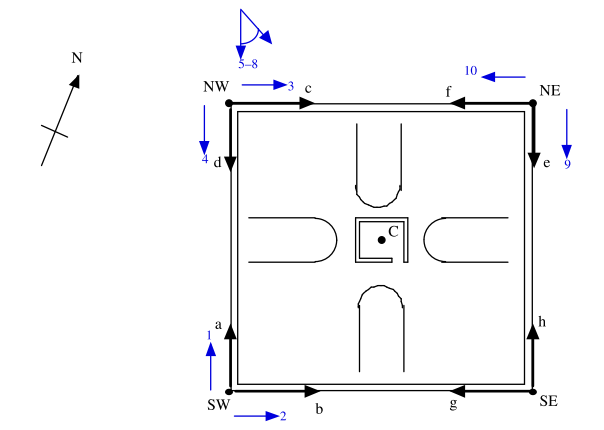 Os seguintes fatos parecem ser importantes: as paredes do complexo do templo foram construídas de grandes pedras e argamassa, a espessura das paredes média 1,5m; a largura das portas foi, em média, também 1,5m; e o acesso a qualquer um dos quartos do complexo era possível através de portas nos corredores externos.