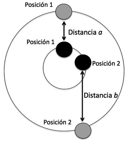 Figura 10. Variación de distancia entre los planetas, aun en órbitas perfectamente circulares. Nota: Obsérvese que la distancia a entre la posición 1 del planeta gris y el planeta negro es menor que la distancia b, entre las posiciones 2 de los mismos planetas.