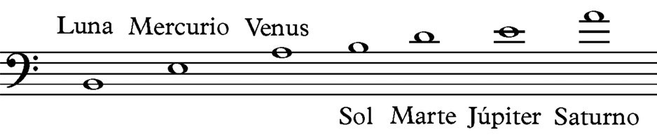 Figura 8. Los llamados puntos fijos del sistema mayor de teoría musical griega y su asignación directa a los siete planetas antiguos relacionado con su cercanía al centro del sistema solar.