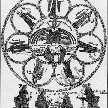 A dama Philosophia tendo abaixo de si Sócrates e Platão e rodeada pelas sete artes liberais