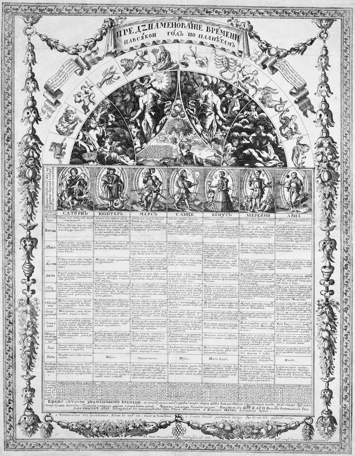 Os calendários apresentavam uma abundância de informações astrológicas. Assim, depois de listar os principais eventos cronológicos relevantes para a história russa, os calendários forneceram informações sobre os signos do zodíaco e os sete planetas. Todos os meses continham previsões sobre o clima, e as publicações também continham prognósticos principalmente relacionados a assuntos militares e assuntos de saúde. O calendário de 1713, por exemplo, impresso em Moscou em dezembro de 1712, afirmava que a posição dos planetas prenunciava a paz para 1713, além de afirmar que a saúde geral também seria melhor do que no ano anterior. A única exceção a esse formato padrão foi o primeiro calendário impresso em São Petersburgo no final de 1713 (para o ano seguinte), que excluiu todos os prognósticos. No entanto, as direções definitivas nas previsões astrológicas do calendário eram limitadas pelo próprio Pedro, o Grande. Em 23 de novembro de 1714 o Czar escreveu a Ivan Musin-Pushkin (1661-1729), que supervisionou a publicação dos calendários, informando-o dos prognósticos que seriam impressos nas próximas edições.