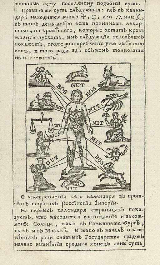 Cada calendário anual também continha informações relacionadas ao corpo humano como um microcosmo do cosmos, que designava o significado zodiacal para partes específicas internas e externas do corpo. Como Katharina Volk observou, essa doutrina – conhecida como ‘melothesia’ – foi defendida por Marcus Manilius (século I d.C.) em seu influente tratado Astronomicon. Assim, a ilustração do ‘homo signorum‘ presente na edição de 1721 do calendário russo (figura 3) está inteiramente de acordo com essa tradição astrológica clássica. A folha fornece informações astrológicas relativas a tempos propícios para sangria de veias e vasos (O krovopuskanii zhelnom i rozhechnom) e quando tomar remédios (kogda lekarstvo prinimat’) durante janeiro de 1721. Sob a ilustração do ‘homo signorum‘, pode-se ver as datas designadas para a sangria dependendo se a pessoa tem um temperamento úmido, colérico ou melancólico. O gráfico também fornece os melhores dias do mês para tomar remédios que induzam a diarreia e o enjoo.