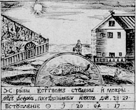 O corpo principal da folha apresenta doze colunas verticais com símbolos e emblemas do zodíaco, acompanhados de uma breve descrição das qualidades de cada signo. Assim, Peixes é afirmado como sendo “frio e seco” por natureza e é acompanhado por um emblema representando dois pescadores, além de uma horta à esquerda banhada pelo Sol (figura 5). Os dados astronômicos fornecidos em cada uma das doze colunas referem-se ao nascer do Sol diário, ao pôr do Sol e às durações do dia e da noite de acordo com a latitude de Moscou.