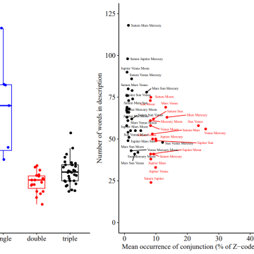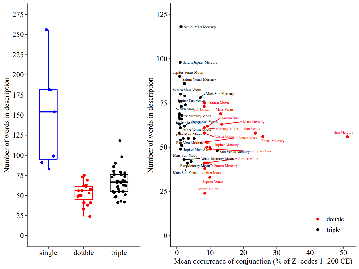 Figura 1: A extensão das descrições sugere importância conceitual. Esquerda: Valens escreve longas descrições mais simples do que em média, mas dedica mais tempo a ‘triplas’ do que para ‘duplas’. Certo: não há relação entre a ocorrência de uma conjunção dos corpos envolvidos em uma conjunção e o número de palavras que Valens usa para descrever suas qualidades. N.B. o eixos y são de uma escala diferente entre os gráficos.