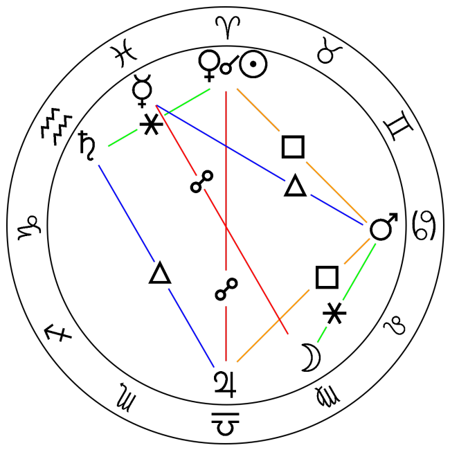 Figura 6: Um horóscopo de exemplo com o código Z A6300B5. O anel exterior mostra os signos zodiacais; o anel interior mostra as posições dos planetas. As relações dos aspectos são mostradas na cor das linhas: oposição (vermelho), quadratura (laranja), trígono (azul), sextil (verde).