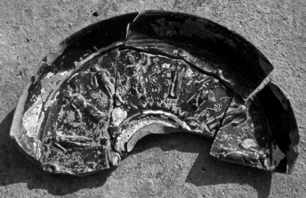 Cada placa foi moldada como um segmento de arco abrangendo aproximadamente 28 graus, 30mm de largura, cerca de 55mm de comprimento por fora, cerca de 40mm de comprimento por dentro e geralmente de dois a três milímetros de espessura. Eles teriam sido montados em um plano (de madeira?) superfície à qual eles teriam sido fixados por um adesivo. Linhas incisas paralelas que cruzam o verso das placas (Figura 7) podem ter como objetivo fornecer uma melhor aderência ao adesivo.