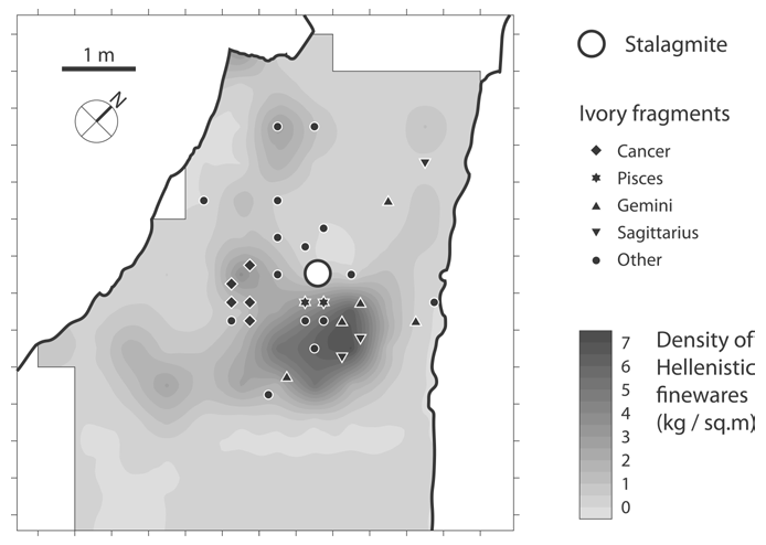 Todos os fragmentos de marfim gravados foram recuperados durante a peneiração úmida. Muitos deles, incluindo os fragmentos maiores e mais bem preservados, vieram da área imediatamente em frente à estalagmite proeminente, que também continha a maior parte os vasos de porcelana helenística (Figura 4). Outros fragmentos menores foram espalhados a dois metros de distância da estalagmite.