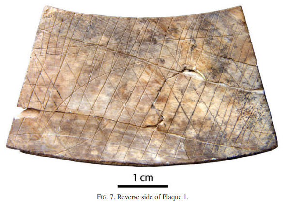 Mais quatro fragmentos preservam partes de desenhos gravados. Um aparentemente retrata uma perna (humana?) (Figura 6:7), outra pode estar mostrando uma perna de um animal (Figura 6:6), enquanto os dois restantes, embora cuidadosamente executados, são fragmentados demais para serem reconhecíveis (Figuras 6:5 e 6:8). Os fragmentos restantes têm o lado anverso liso.
