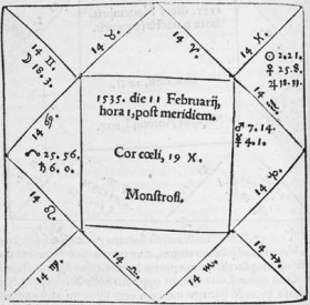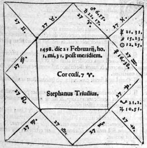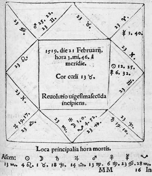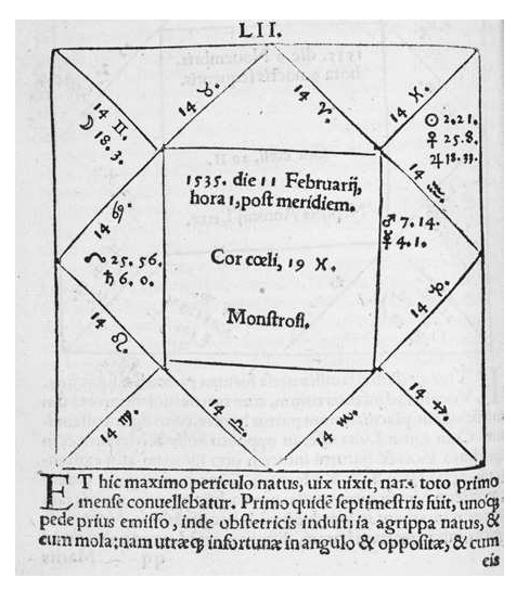 No Renascimento, obter o molde do mapa astral certamente não era uma experiência incomum, e sua popularidade como itens colecionáveis é amplamente demonstrada por sua aparição impressa, primeiro em uma série de obras de Girolamo Cardano,11 depois no Tractatus astrologicus de Luca Gaurico (1552) e, finalmente, em sua forma mais majestosa, no Astrologiae methodus de Johannes Gartze de 1576 (que, em uma seção dedicada intitulada Iudicia geniturarum, inclui centenas de gráficos).12 O gênero tornou-se tão popular e tão central para qualquer defesa da astrologia, que, pelo menos em um livro do século XVII por um detrator da astrologia – Astrologia ratione et experientia refutata de Sixtus ab Hemminga (1583) – sua refutação foi realizada analisando trinta genituras (ou seja, mapas de nascimento) de homens famosos extraídos das obras de Cardano, Gaurico e do astrólogo alemão Cyprian Leowitz. Neste trabalho, a análise foi feita de forma a refutar seu valor e demonstrar que sua interpretação era arbitrária, contraditória e insustentável.13