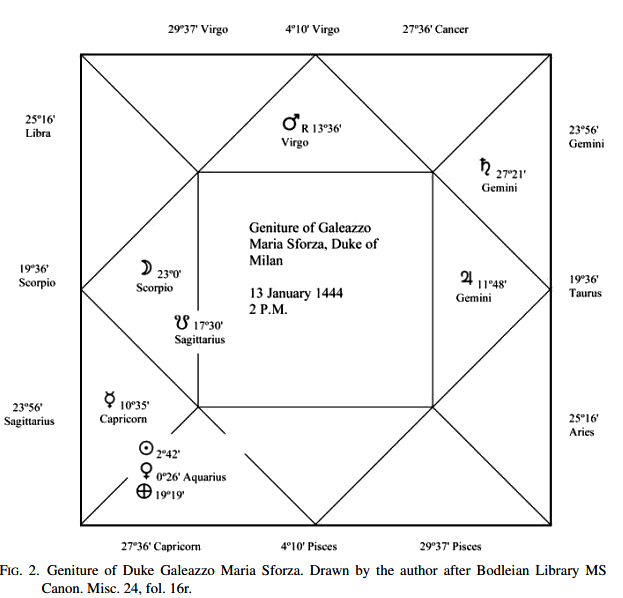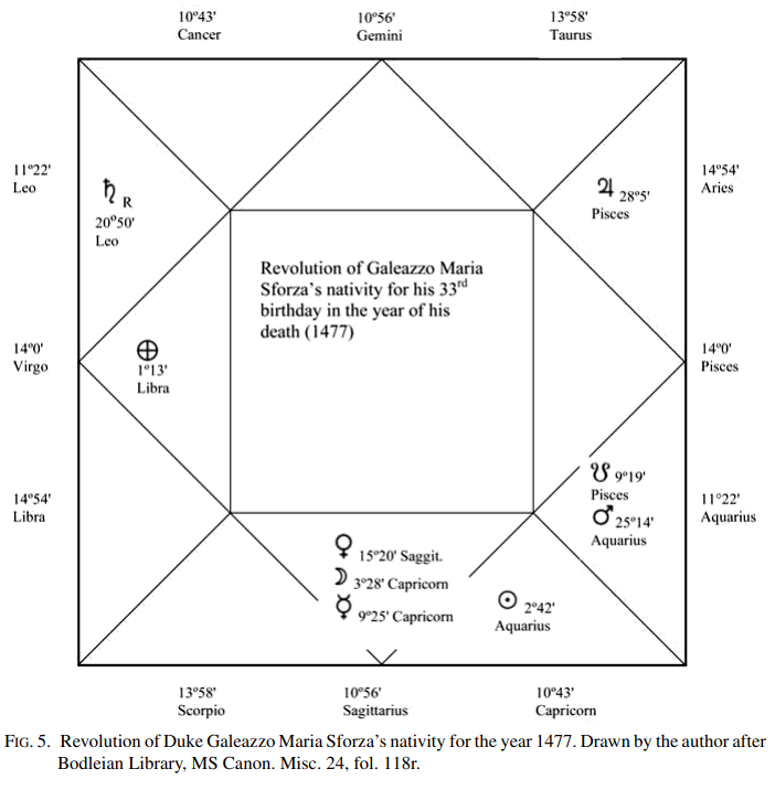 Confirmações semelhantes podem ser encontradas em muitos outros mapas: por exemplo, o assassinato do duque de Milão Galeazzo Maria Sforza em 1476 pode ser claramente explicado pelo fato de que Saturno, o planeta maléfico por excelência, foi colocado na oitava casa (a casa de morte) e em um signo humano (Gêmeos), enquanto os luminares estavam em detrimento (a Lua estava em Escorpião e o Sol em Aquário), assim como Júpiter (que estava em Gêmeos). Marte, além disso, estava angular (na décima casa, perto do meio do céu), e Escorpião estava no ascendente (Figura 2). Para elucidar ainda mais seu ponto, Gazio recorreu à força de suas autoridades, invocando nada menos que um autor como Ptolomeu, que havia alertado o astrólogo para “ficar longe de um mapa no qual você encontra Marte angular, e particularmente com Escorpião ascendente”. Gazio acrescentou, porém, que o duque era atraente (pulcher), pois a Lua estava em seu ascendente (in horoscopo), e Saturno, Júpiter, Marte, Vênus e a pars fortuna estavam todos em signos humanos (respectivamente em Gêmeos, Virgem e Aquário). Em tal julgamento, Gazio seguiu de perto os preceitos delineados em seu Opus astrologicus, onde uma das muitas ‘condições’ listadas sob o ‘tipo’ pulcher estabelecia que uma pessoa seria bonita se “todos, ou a maioria, dos planetas estiverem nos signos humanos de Gêmeos, Virgem, Libra, Sagitário e Aquário”. Mas Gazio, pelo menos neste caso, poderia ir ainda mais longe, e explicar por que Galeazzo havia morrido em uma igreja: isso porque no momento de sua morte em 26 de dezembro de 1476, Saturno, o planeta que lhe havia prometido uma morte violenta (malam mortem) no radix (isto é, o mapa natal original), estava retrógrado e na nona casa, a casa das viagens, religião e honras, e numa colocação infeliz porque em seu próprio detrimento (nomeadamente em Leão) (Figura 5). Aos olhos dos astrólogos renascentistas, mortes violentas como a de Galeazzo Maria devem ter representado exemplos particularmente desejáveis. A coleção de Gazio não apenas contém um número de indivíduos que morreram dessa maneira, mas um “padrão” semelhante pode ser encontrado no Tractatus astrologicus (1552) de Luca Gaurico, onde Gaurico reserva toda uma seção de sua obra para aqueles homens e mulheres que morreram morte violenta, incluindo – o mais famoso – o primeiro duque de Florença Alessandro de’ Medici e seu assassino, seu primo Lorenzino de’ Medici. (A seção é apropriadamente intitulada De Biothanatis, hoc est violenta strage peremptis).49