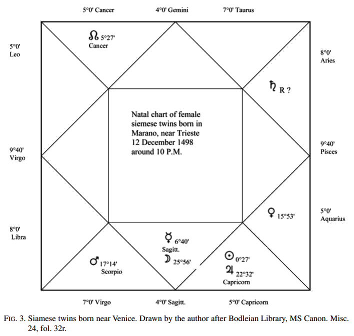 Como observado, deficiências físicas de vários tipos também podiam ser investigadas astrologicamente, e por essa razão tanto Gazio quanto Cardano incluíram em suas coleções o mapa de um nascimento monstruoso. O de Gazio baseou-se novamente em sua própria experiência pessoal e referiu-se ao nascimento de gêmeos siameses na área de Marano Lagunare, perto de Grado, no Golfo de Trieste (Figura 3). As duas meninas nasceram com duas cabeças, um corpo, quatro braços e quatro pernas, duas dentições completas e um coração e um fígado entre elas. Uma delas, dizem, viveu por quatro horas, enquanto a outra já estava morta ao nascer. Infelizmente não temos um comentário para acompanhar o gráfico de Gazio, mas o gráfico de Cardano para um evento semelhante pode ser ilustrativo da maneira como Gazio o teria lido (Figura 4). Quando o ‘monstro’ de Cardano nasceu, como ele nos conta, com grande dificuldade no sétimo mês, ambos os planetas malignos (ou seja, Marte e Saturno) estavam angulares e em oposição um ao outro, e com eles Mercúrio, regente da casa da Lua (Gêmeos), com Júpiter, regente do ascendente (Câncer), cadens (ou seja, no signo oposto à sua exaltação, neste caso Capricórnio) e combustus (isto é, muito próximo dos raios solares)62. Embora não nos seja dito com que tipo de defeito de nascença ele nasceu, Cardano faz questão de explicar que, como a Lua estava em trígono com Júpiter e Vênus, essa pessoa teria uma constituição monstruosa. No entanto, pelo mapa (ex radicibus nostris), Cardano também poderia prever que esta pessoa teria sorte com uma herança, ganharia dinheiro e casaria, mas teria azar com sua saúde e longevidade e seria posto à prova por muitos perigos externos.