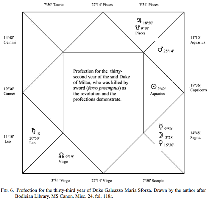 As revoluções baseavam-se na ideia de que o momento em que o Sol retornava ao ponto específico da eclíptica onde se encontrava no momento do nascimento de uma pessoa era particularmente significativo para os eventos relacionados àquele ano. Ao traçar o mapa do trigésimo segundo aniversário de Galeazzo, portanto, Gazio usou a revolutio mortis do duque de Milão para obter uma visão mais aprofundada dos eventos que cercaram sua morte (Figura 5). Na revolutio, o ascendente, por exemplo, estava no mesmo signo, e quase no mesmo grau, onde Marte estava na natividade de Galeazzo (14º Virgem na revolutio, 13º 36′ Virgem no radix), e isso não era auspicioso, já que Marte é um planeta maléfico. Além disso, Mercúrio, o senhor da casa da morte no radix, estava na quarta casa com a Lua, que estava em seu próprio detrimento e, portanto, colocado desfavoravelmente, enquanto Júpiter estava na mansão de Saturno. Tudo isso não era um bom presságio para o duque, mas o que era particularmente significativo, pelo menos para Gazio, era que Marte estava na sexta casa, a dos servos, e isso lhe prometia a morte nas mãos de um servo. Isso foi ainda mais reforçado pelo fato de que na revolutio Saturno retrógrado estava na décima segunda casa, a dos inimigos ocultos. Uma vez que a previsão foi comparada com eventos da vida real, a imagem ficou bastante clara: Gazio sabia que Galeazzo Maria seria morto por três de seus súditos em uma emboscada na catedral de Milão, e isso foi amplamente confirmado pela configuração planetária de sua revolução. Mas, como se isso não bastasse, usando outra técnica astrológica que se acreditava ser particularmente útil para previsões de curto prazo, Gazio desenhou também um profectio. A partir desse mapa ele pôde ver que a Lua, que significava o corpo, estava na sexta casa, a casa dos servos, junto com Mercúrio, que, como observado antes, era o regente da casa da morte no radix, enquanto o fato do signo na cúspide da oitava casa ser o signo humano de Aquário confirmou mais uma vez que a morte viria de um homem.