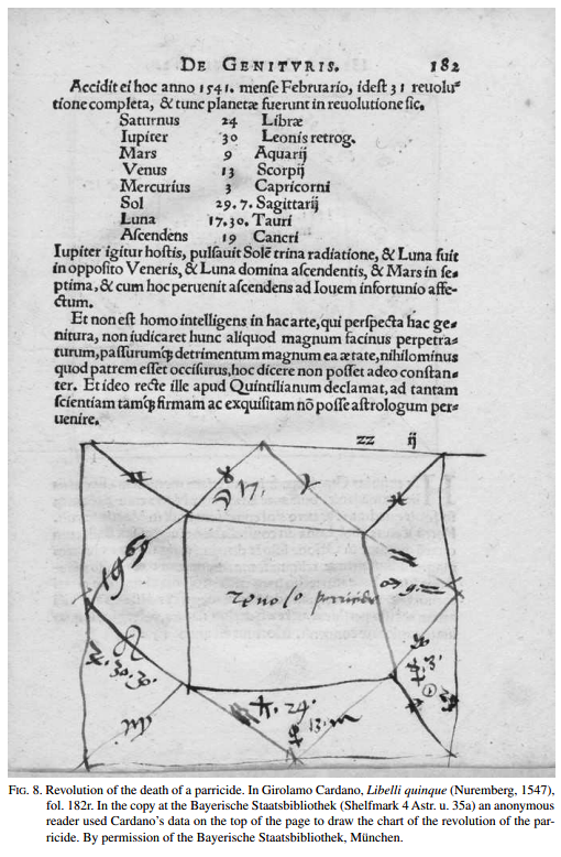 Revoluções e profecções forneciam previsões de curto prazo relacionadas a um ponto específico no tempo ou a um determinado ano. Podemos supor, portanto, que sua relevância foi limitada a momentos particulares ou eventos específicos na vida de um indivíduo. Assim como os calendários anuais, portanto, revoluções e profecções seriam descartadas depois de um tempo como não mais relevantes, a menos que, como no caso de Gazio, fossem usadas para verificar eventos específicos e testar a confiabilidade de sua própria arte. Esta é provavelmente uma das razões pelas quais dificilmente as encontramos em coleções de genituras, sendo a única exceção as revoluções de morte (revolutio mortis), que Cardano incluiu no Libelli quinque com relativa frequência na forma de prosa explicativa dentro do texto, ou mais raramente na forma numérica (Figura 8). Curiosamente, a grande maioria dos gráficos de revoluções que encontramos no Libelli quinque não estão no texto explicativo de Cardano sobre revoluções (Livro IV do Libelli), nem na colecção de genituras (Livro V), mas dispersas entre os muitos aforismos que compõem o último livro da sua obra. Uma vez mais a maioria destas são revoluções da morte (Figuras 9 e 10).