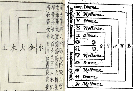 Fig. 1 – Os domicílios dos planetas: esquerda, Tianxue shiyong(p. 21); direita, Isagoge (fol. 43)